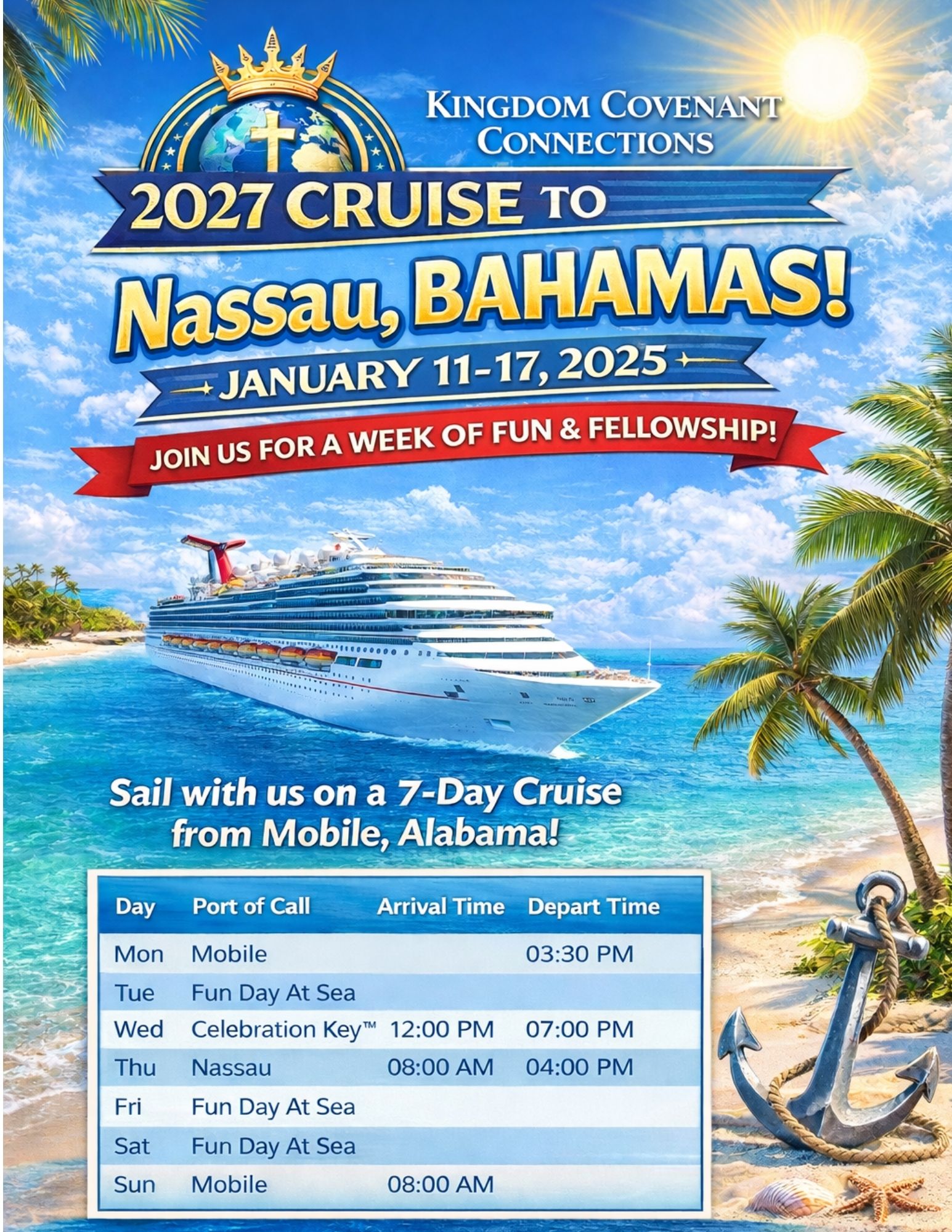 Kingdom Covenant Connections invites you to embark on an exciting 5-night Bahamas Carnival cruise from Mobile, Alabama, to Nassau, Bahamas, happening January 11-17, 2027. Join us for an inspiring and relaxing journey filled with beautiful ocean views, unforgettable moments, and an opportunity to connect with like-minded travelers!